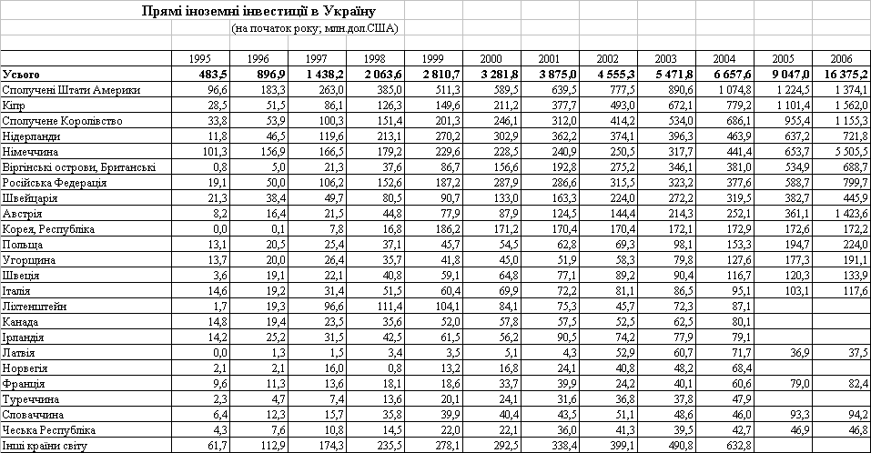 В табл.2.4 – 2.6 наведені результати первинних статистичних досліджень за іноземними інвестиціями в Україну з 2002 по 2006 роки за даними Держав-ного комітета статистики України, наведеними на офіційному сайті.
