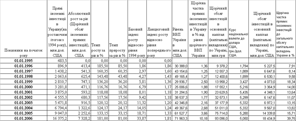В ході статистичного аналізу показників рівня іноземних прямих інвести-цій в економіку України у 1995 –2005 роках розраховувались наступні показ-ники в динаміці: