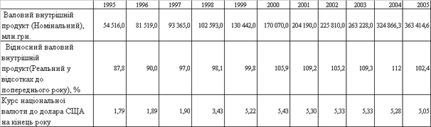 Динаміка ВВП України та курсу національної валюти у 1995 –2005 році