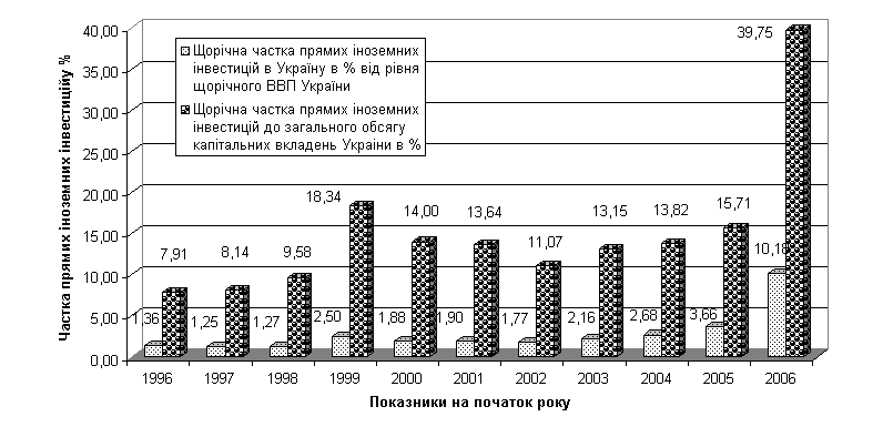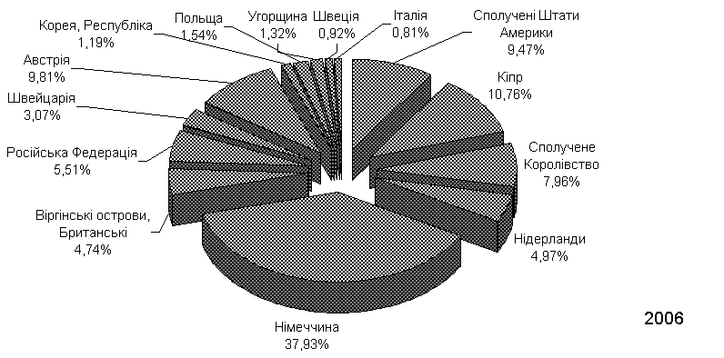 Загальний накоплений обсяг прямих іноземних інвестицій в Україну на 01.01.2006 р. становив 16 372,2 млн. дол. США, з них біля 5 500 млн.доларів США (30%) надійшли у 2005 році в вигляді прямих інвестицій придбання “Криворіжсталі” (інвестор – Німеччина) та АППБ “Аваль” (інвестор – Австрія), що суттєво змінило структурні співідношення в обсягах та географії інвестицій, які надійшли в Україну зі 113 країн світу.
