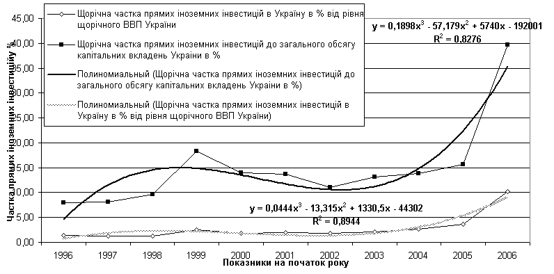 Рис.3.4 Нелінійний регресійний аналіз динамічних рядів відносних рівнів іноземних інвестицій в економіці України
