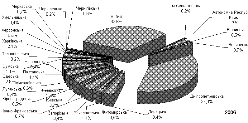 Аналіз розподілу сум прямих іноземних інвестицій, вкладених в економіку України по областям та виділеним містам України станом на 01.01.2004 року(рис.3.8) та на 01.01.2006 року(рис.3.9) показує, що найбільші частки інвестовані в наступні промислово-розвинуті області України: