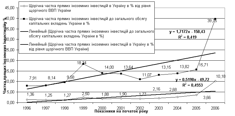 Рис.3.3 Лінійний регресійний аналіз динамічних рядів відносних рівнів іноземних інвестицій в економіці України