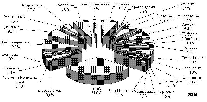 Рис.3.8 Розподіл іноземних інвестицій по областям України станом на 01.01.2004 року