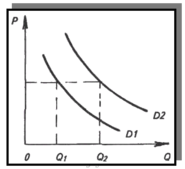 При увеличении среднего дохода покупателей, при прочих равных условиях, кривая спроса D 1 сместится вправо вверх и тому же уровню цены Р 1 будет соответствовать возросший уровень спроса Q 2.