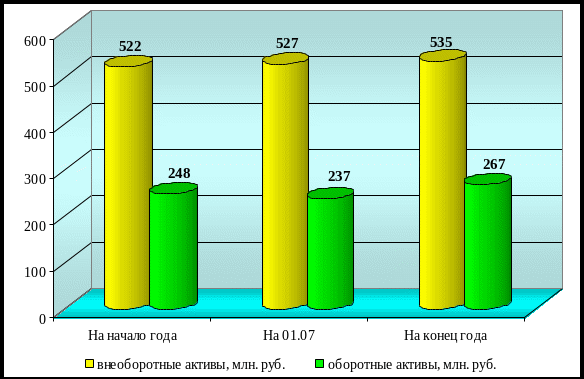 На конец периода внеоборотные активы составили 535 млн. руб. и по сравнению с 01.07. они увеличились на 8 млн. руб., темп роста составил 101,5% (535 / 527 × 100%), то есть внеоборотные активы увеличились по сравнению с 01.07. на 1,5%. В структуре внеоборотных активов на конец периода по сравнению с 01.07. произошли следующие изменения: увеличение на 3 млн. руб. основных средств, удельный вес в общей сумме актива баланса снизился на 2,7%; увеличение на 5 млн. руб. нематериальных активов, удельный вес в общей сумме актива баланса вырос на 0,6%; вложения во внеоборотные активы остались неизменными и составили 35 млн. руб., удельный вес в общей сумме актива баланса снизился на 0,2%.