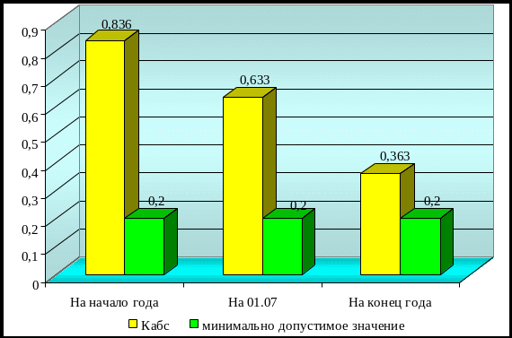 | Коэффициент абсолютной ликвидности Кабс = (стр.260+стр.270баланса)/ /(стр.790-стр.720баланса) | 0,836 | 0,633 | 0,363 | Кабс0,2 |
