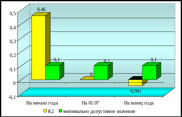 | Коэффициент обеспеченности собственными оборотными средствами К2 = (стр.590+стр.690-стр.190)/стр.290 | 0,46 | 0 | -0,041 | К20,1 |
