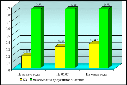 | Коэффициент обеспеченности финансовых бязательств активами К3 = стр.790/стр.390 или стр.890 | 0,174 | 0,31 | 0,347 | К30,85 |