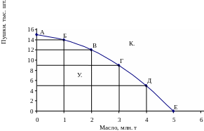На графике альтернативы представлены кривой производственных возможностей, или кривой трансформации. При абсолютном использовании ресурсов (в экономике полной занятости) все точки возможных комбинаций производства пушек и масла находятся на границе производственных возможностей. Если же производственные мощности загружены не полностью, различные комбинации производства масла и пушек находятся не на кривой трансформации, а, например, в точке У. В данной ситуации при использовании имеющихся незанятых ресурсов можно увеличить и гражданское, и военное производство, а точка У на графике сместится в любую точку на кривой трансформации (например, в точку В).