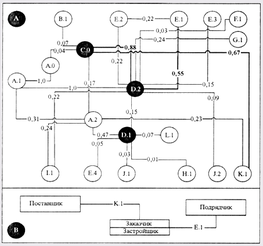 Рис. 1. Сетевая диаграмма рисков (А) технического заказчика – генерального подрядчика и структура субъектов ИСК, объединенных системными рисками (Экспертные оценки вероятности реализации угрозы установлены поданным 2009 г.)