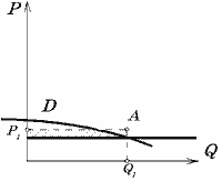 Если же спрос на продукт монополиста высокоэластичный и кривая спроса имеет пологий вид (рис. 3.6.6), монополисту не выгодно будет значительно повышать цену, так как это очень сильно сократит объем спроса, а сокращение объема спроса уничтожит всю выгоду от увеличения цены. В этом случае монополист выберет точку А (именно эта точка соответствует прямоугольнику под кривой спроса, имеющему максимальную площадь). Цена при этом вырастает очень незначительно (на графике = всего на 20 или 30%).