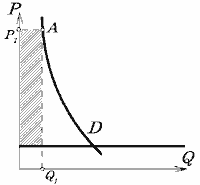 По существу выбор монополиста сводится к выбору точки на кривой спроса на его продукт. Предположим, что на рис. 1 изображена кривая спроса на продукт монополиста. Монополист может выбрать точки А, Б, В или любую другую точку на кривой спроса. Точки, лежащие над кривой спроса, ему недоступны. Почему он не выбирает точки, лежащую под кривой спроса? Конечно, он может выбрать такую точку = например, точку Г = производить количество Q1 и продавать его по цене Р1. Но это будет противоречить его желанию получить максимум прибыли = ведь он может запросто поднять цену до значения Р2 и увеличить свою выручку на величину площади заштрихованного прямоугольника. Какое бы количество продукта ни решил монополист выставить на рынок, он попытается назначить на него максимально возможную цену.