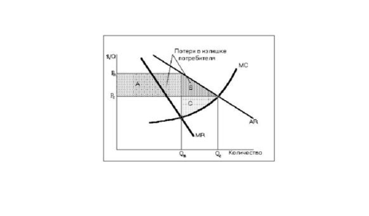 При монополии цена выше и потребители покупают меньше продукции. Из-за более высокой цены те потребители, которые покупают товар, теряют часть излишка, показанную прямоугольником А. Те потребители, которые не могут купить товар по цене Рm, но купили бы его по цене РC, также теряют излишек в размере площади треугольника В. Следовательно, совокупная потеря потребительского излишка составляет А + В. Производитель, однако, получает прибыль, обозначенную прямоугольником А, продавая товар по более высокой цене, но теряет часть излишка, обозначенную треугольником С, представляющую собой дополнительную прибыль, которую производители получают от продажи (QC - Qm) по цене РC. Общая прибыль производителя, следовательно, составит А - С. Вычитая потерю потребительского излишка из прибыли производителя, мы получим чистые убытки, равные В + С. Это полные чистые убытки от монопольной власти. Даже если прибыли монополиста были обложены налогом и перераспределены в пользу потребителей продукта, эффективность не будет достигнута, потому что объем производства будет ниже, чем в условиях свободной конкуренции. Общие чистые убытки - это общественные издержки такой неэффективности.