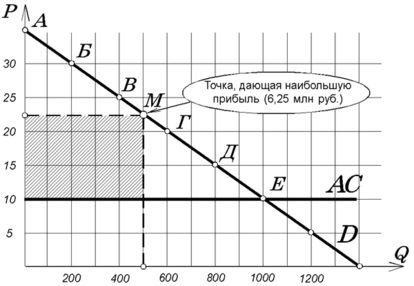 Таким образом, монополисту невыгодно выходить за пределы отрезка ВГ и следует искать оптимальную точку внутри него. Перебрав все возможные варианты он обнаружит, что максимальная прибыль достигается в точке M и равна 6,25 млн рублей. Любая соседняя точка будет означать уменьшение прибыли. Так как точка М является самой выгодной для монополиста, он установит выпуск 500 тысяч коробков в неделю и будет продавать их по цене 22,5 рубля.