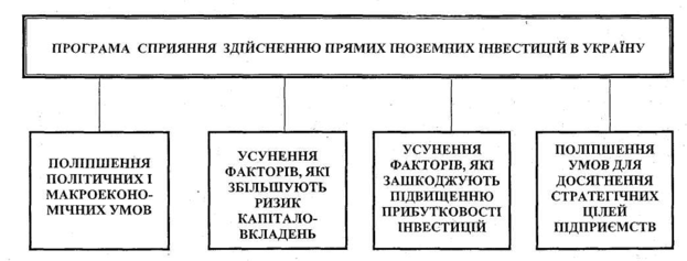 Отже, створення сприятливого інвестиційного клімату в державі в першу чергу пов'язане зі здійсненням заходів для сприяння залученню прямих іноземних інвестицій, до яких слід віднести: