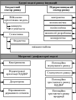 Матричні моделі ринку нововведень дають можливість подати його основні типи у взаємозв'язку ключових чинників, що впливають на інноваційні процеси. Так, моделі державного ринку інновацій визначаються двома чинниками — часткою державного сектору в загальному обсязі НДДКР та місткістю (інтенсивністю) державного сегмента ринку військово- і пріоритетно-орієнтованих НДДКР.