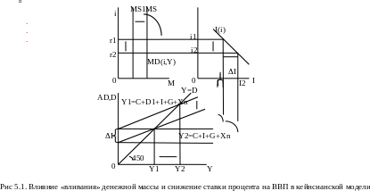 На графиках мы видим, как при заданном спросе МД увеличение денежной массы (с МS1 до МS2) приводит к уменьшению ставки процента (с r1 до r2), а это вызывает рост инвестиций (с I1 до I2) и увеличение национального продукта (с Y1 до Y2).