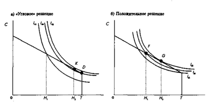 В соответствии с моделью предложения труда выбор между ситуацией, когда человек не работает совсем, и ситуацией, когда определенное число часов он отдает работе за заработную плату, определяется ставкой заработной платы, нетрудовым доходом и индивидуальными предпочтениями между трудом и досугом. На рис. 1.2 для одних и тех же ставки заработной платы и нетрудового дохода изображены различные индивидуальные предпочтения двух человек. На рис. 1.2 а количество часов работы будет Н1 (индивидуальная кривая безразличия IА11 и линия бюджетных ограничений будет касаться в точке е, соответствующей Н1 часам работы), на рис. 1.2б количество часов работы будет нулевым, Н = 0 (индивидуальная кривая безразличия IВ1 касается линии бюджетных ограничений в точке b, соответствующей нулевым часам работы.). Ситуация, представленная на рис. 1.2б, когда принимается решение не работать, называется угловым решением.