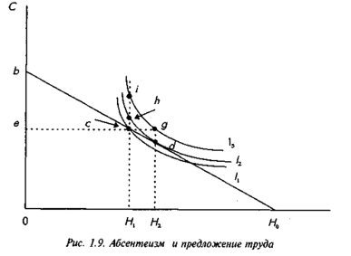 На рис. 1.9 H1 - это стандартная продолжительность рабочего времени, равновесие достигается в точке с, где кривая безразличия полезности работника I1 пересекается с линией бюджетных ограничений при стандартной продолжительности работы. За счет абсентеизма может быть достигнут более высокий уровень полезности на кривой безразличия I2 в точке d, соответствующей H2 часам работы. Если существует система выплат по болезни и временной нетрудоспособности с полной компенсацией дохода, то работник, прибегая к абсентеизму и неоправданно увеличивая время нетрудоспособности, может обеспечить себе в точке g еще более высокий уровень полезности с кривой безразличия I3 и с сохранением дохода е.