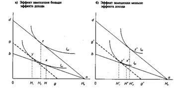 Рис. 1.6 - Эффекты дохода и замещения при увеличении ставки заработной платы