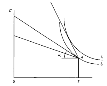 Наклон кривой безразличия равен предельной норме замещения досуга благами в данной точке (MRSLC) и равен углу наклона касательной к кривой безразличия в данной точке. Предельная норма замещения досуга благами уменьшается по мере увеличения досуга: