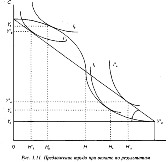 На рис. 1.11 видно, что работники типа В предпочтут сдельную оплату труда повременной, так как первая предоставит им одновременное увеличение дохода YB по сравнению с Y’B и сокращение часов отработанного времени с H’B до HB. И наоборот, работники типа А предпочтут повременную оплату, так как она даст им более высокий доход Y’A при меньшем по продолжительности рабочем дне H’A.