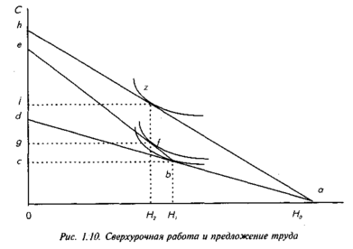 Возможность получения сверхурочных повышает предельную ставку заработной платы при работе сверх H0H1 часов и приводит к возникновению новой точки равновесия f. Более высокая предельная ставка заработной платы при работе сверх H0H1 часов побуждает работника работать H0H2 часов, из них H1 H2 сверхурочно. Доход индивидуума составляет (0d/0a) H0H1 + (ce/cb) H1 H2. Для работодателя оплата сверхурочных часов работы по более высокой ставке заработной платы более выгодна, чем изменение базовой ставки заработной платы. На рис. 1.10 показано, что стимулировать индивидуума к работе в количестве H2 часов можно также при увеличении ставки заработной платы до уровня 0h/0а, но в этом случае выплачивать повышенную заработную плату необходимо на протяжении H0H1 часов работы, и совокупный доход работника составит 0j, что превышает совокупный доход 0g, выплаченный ему работодателем при повышенной оплате только сверхурочных часов работы.