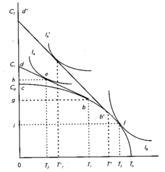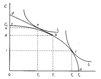 Индивидуум с кривой безразличия IА имеет относительно более сильное предпочтение товаров (товаро-интенсивная комбинация С и L). Этот индивидуум избирает точку е, максимизируя полезность в соответствии с ограничением возможностей потребления. Такой выбор включает (0T2) времени потребления (досуга), (T1 T2) единиц времени работы на рынке и (T0 T1) единиц времени работы в домашнем хозяйстве. Индивидуум А потребляет 0g единиц домашних товаров и gh - рыночных товаров. Индивидуум с кривой безразличия IB имеет относительно большее предпочтение досуга (досуго-интенсивная комбинация С и L), избирая точку f. Индивидуум В не работает на рынке, деля время между досугом (0T3) и работой дома (Т0 T3), потребляя 0i, домашних товаров и не потребляя рыночных товаров.