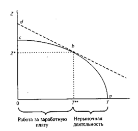 Граница производственных возможностей домохозяйства может быть представлена линией abd на рис. 1.21. Наклон кривой abc представляет предельную производительность домашней работы, а наклон линии bd означает предельную отдачу от работы на рынке (т. е. заработную плату). Представим, что домохозяйство находится в точке Т и принимает решение, как распределить первую единицу времени. Поскольку отдача от производства в домашнем хозяйстве превышает рыночную отдачу, предпочтение отдается работе дома. Это справедливо для всех последующих часов, пока не достигается точка Т = Т**, где отдача от рыночной деятельности превышает отдачу от дальнейшей работы дома. Поскольку заработная плата предполагается постоянной, это справедливо для всех последующих часов. Таким образом, линия abd образует границу производственных возможностей домохозяйства.