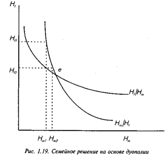 Один из вариантов таких моделей основывается на модели дуополии. Кривая реакции первого супруга Hm/Hf и кривая реакции второго супруга Hf/Hm показаны на рис. 1.19. Каждая кривая реакции показывает оптимальный (максимизирующий индивидуальную полезность) выбор количества часов работы данным супругом при определенном количестве часов работы другого супруга. Если второй супруг предлагает Hf1 часов работы, то оптимальным выбором для первого супруга будет Hm1 часов работы. Однако это решение неустойчиво. В ответ на выбор первым супругом количества часов работы Hm1 второй супруг будет оптимизировать свое поведение и выберет Hf2 часов работы. Этот процесс будет продолжаться до тех пор пока решение о выборе часов работы не будет соответствовать точке е на кривых реакции супругов (е - точка пересечения кривых реакции). В данном случае точка е - точка устойчивого равновесия для обоих супругов. Но если наклоны кривых реакции обратны, то точка е не будет точкой устойчивого равновесия. Достаточным условием существования устойчивого равновесия является то, что потребительские блага - нормальные блага для обоих супругов.