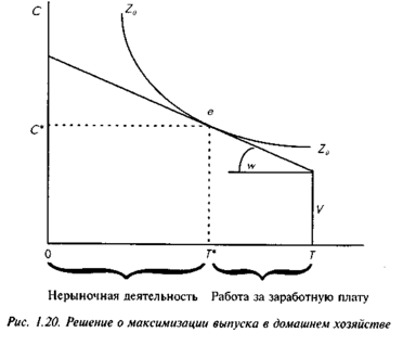 Это решение представлено на рис. 1.20. Наклон изокванты Z может быть определен как теневая заработная плата нерыночной деятельности. Таким образом, домохозяйство максимизирует производство благ в точке, где норма замещения товаров временем равна рыночной заработной плате. Видно, что слева от е z > w и домохозяйству выгоднее заниматься нерыночной деятельностью, и наоборот, справа от е z < w домохозяйству выгоднее заниматься рыночной деятельностью. Хотя показано только внутреннее решение, возможно и угловое решение.
