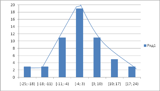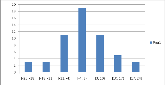 | Границы | [-25; -18) | [-18; -11) | [-11; -4) | [-4; 3) | [3; 10) | [10; 17) | [17; 24) |