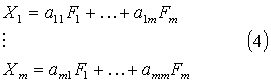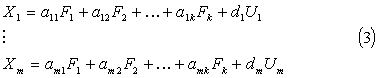 может быть представлен как функция небольшого числа общих факторов F1,F2,…,fk и характерного фактора Uj. При этом считается, что каждый общий фактор имеет существенное значение для анализа всех исходных признаков, т.е. фактор Fj -общий для всех X1,X2,...,Xm. В то же время изменения в характерном факторе Uj воздействуют на значения только соответствующего признака Xj. Таким образом, характерный фактор Uj отражает ту специфику признака Xj, которая не может быть выражена через общие факторы.