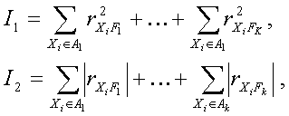 Формально задача об одновременной группировке параметров и выделении существенных факторов заключается в максимизации как по разбиению параметров на множества {A1,…,Ak} так и по выбору факторов {F1,…,Fk} одного из двух критериев.