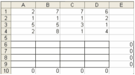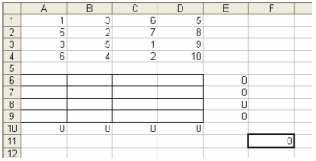F11 = СУММПРОИЗВ(A1:D4;A6:D9) → min.