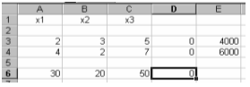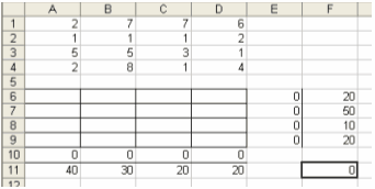 Комірку F11 виділяємо для цільової функції, у яку записуємо формулу: =СУММПРОИЗВ(A1:D4;A6:D9):