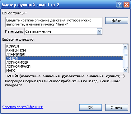 4) в окне «Категория» выбераю Статистические, в окне «Функция» – ЛИНЕЙН. Щелкаю по кнопке ОК (рисунок 2);