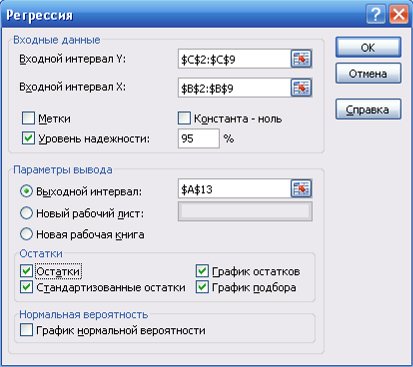 2) в главном меню выбираю Сервис / Анализ данных / Регрессия. Щелкаю по кнопке ОК;