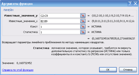 Рисунок 4 Результаты вычислений функции ЛИНЕЙН