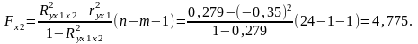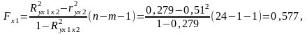 Частные F-критерии оценивают статистическую значимость присутствия факторов х1 и х2 в уравнении множественной регрессии, оценивают целесообразность включения в уравнение одного фактора после другого фактора, т.е. Fх1 оценивает целесообразность включения в уравнение фактора х1 после того, как в него был включен фактор х2. Соответственно, Fx2 указывает на целесообразность включения в модель фактора х2 после фактора х1. Определим частные F-критерии для факторов х1 и х2 по формулам: