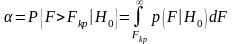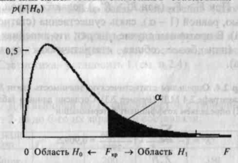 як імовірність того, що при перевищенні розрахунковим значенням F (2.47) деякого критичного значення FKp гіпотеза про відсутність зв'язку Н0 вірна. Очевидно, з імовірністю (1 - α) вона при тім же умові невірна. Закритичну область F > FKp будемо вважати областю дії гіпотези Н1, а докритичну F < FKp - областю дії гіпотези Н0. Тоді імовірність є імовірність помилки першого роду: α=P(H0|H1), тобто імовірність прийняття основної гіпотези H0, тоді як насправді справедлива альтернативна гіпотеза Н1. Графічно ця імовірність визначається як площа під щільністю імовірності p(F) при F > Fkp. Імовірність α (її іноді називають коефіцієнтом значимості) звичайно вибирають малої (рівної 0,05 чи 0,01), після чого для заданих значень імовірності а розраховуються чисельно критичні значення FKp відповідно з урахуванням залежності. Ці значення табулюються, тобто заносяться в таблиці критичних коефіцієнтів чи детермінації критичних значень F-статистики.