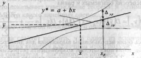 Завжди варто пам'ятати, що однієї з основних задач моделювання є в остаточному підсумку одержати результат прогнозу показника Y для якогось цікавлячого економіста значення фактора хр (у точці прогнозу). Скажемо, при побудові моделі сімейних витрат на харчування в залежності від числа членів родини у вибірку ввійшли родини до 5 чоловік, а ми хочемо спрогнозувати ці витрати для родини з 7 чоловік (хр = 7). Середнє значення прогнозу показника в точці прогнозу хр легко визначається з рівняння моделі: