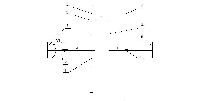 Опишем каждую из подсистем. Первая подсистема включает зубчатое колесо 1 (рисунок 2), которое находиться во внешнем зацеплении с сателлитом 2, вал «а» вращающийся в опоре 7 от привода 5, имеющий крутящий момент Мвх. Вторая подсистема включает: сателлит 2, который имеет внешнее зацепление с подвижным зубчатым колесом 1 и внутреннее зацепление с неподвижным зубчатым колесом 3. Третья подсистема это неподвижное зубчатое колесо 3, которое находиться во внутреннем зацеплении с сателлитом 2. Четвертая подсистема состоит из сателлита 2, вращающегося вокруг оси вала «в» вместе с водилом 4, вала «б», вала «в», опор 8,9 и нагрузки 6.