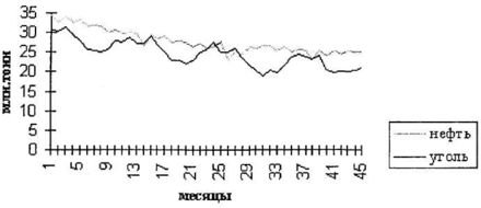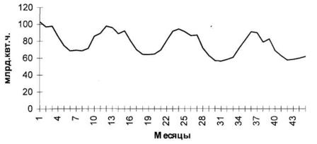 На рисунках 1.2, 1.3 приведены примеры временных рядов, иллюстрирующие присутствие в них указанных компонент. Графики месячных временных рядов производства промышленной продукции наглядно демонстрируют устойчивые сезонные колебания при снижающемся тренде, причем на последнем участке темпы падения производства заметно снижаются.