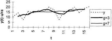 | t | yt | скользящие средние | Взвешенная скользящая средняя g-5 | |