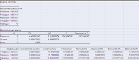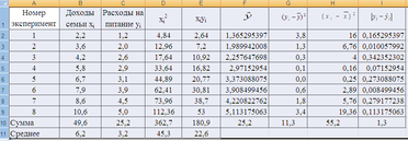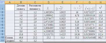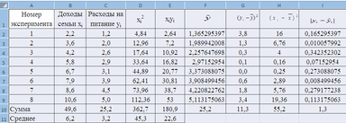 3. Рассчитаем коэффициент детерминации: R2xy = 0,972111224. Значит, 97,2% величины расходов семьи на питание зависит от изменения доходов семьи, а остальные 2,8% связаны с изменением других, не включенных в модель факторов.