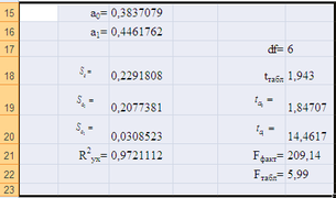 А0 = 0,3837079 А1 = 0,4461762. для вычисления фактических значений t-критерия воспользуемся формулами: ta0 = a0/ Sa0 = 1.84707; ta1 = 14,4617.