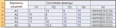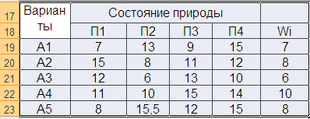 Определяем минимум среднеожидаемого риска. Он равен 2,3, что соответствует пятому решению, которое, следовательно, является оптимальным по данному критерию.