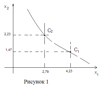 Найдем координаты точки С1. Так как х1=(523-100)/100=4,23, то из уравнения изокванты находим х2=6,23/4,23=1,47. Аналогично находим координаты точки С2. Так как х2=(523-300)/100=2,23, то х1=6,23/2,23=2,79.